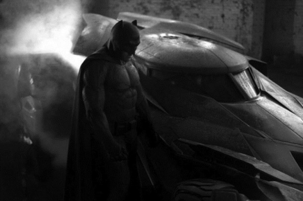 La toute première photo de Ben Affleck vêtu de son costume de Batman version Zack Snyder (réalisateur de Man Of Steel et de Batman VS Superman) a été dévoilée sur Twitter ! On peut apercevoir en noir et blanc, le justicier de Gotham City avec la mythique Batmobile dont une photo a été dévoilée hier sans pour autant la voir complètement, car le bolide était recouvert… Mais quel suspens !