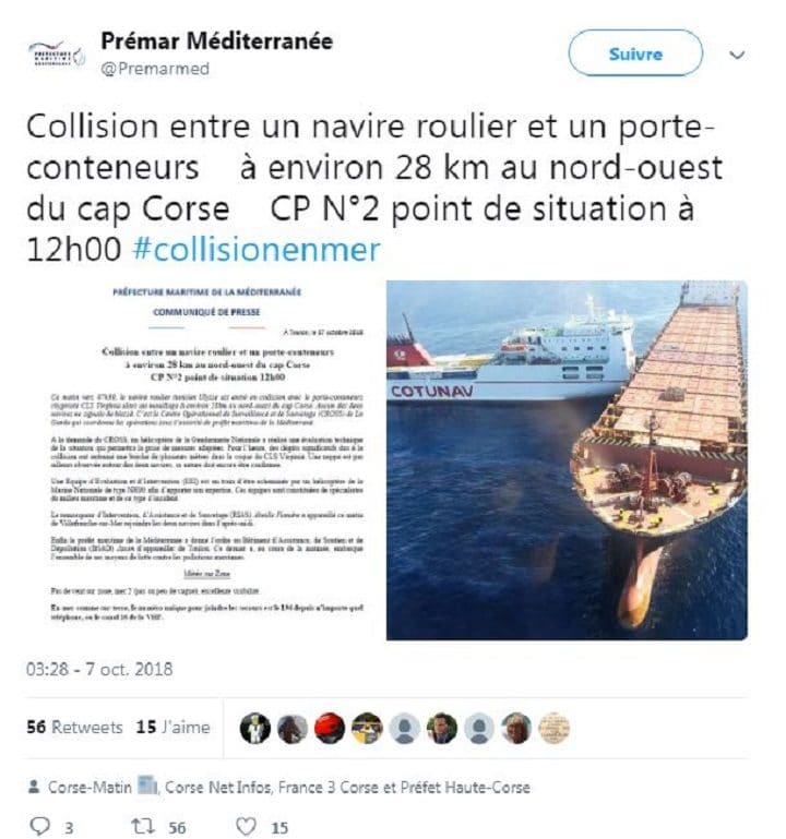 Ce dimanche, une collision entre deux navires s’est produite au nord-ouest du cap Corse. À la mi-journée, la préfecture des Alpes Maritimes indique « des dégâts significatifs dus à la collision ont entraîné une brèche de plusieurs mètres dans la coque de CLS Virginia ». Ils confirment également qu’une « nappe est par ailleurs observée autour des deux navires, sa nature doit encore être confirmée ».