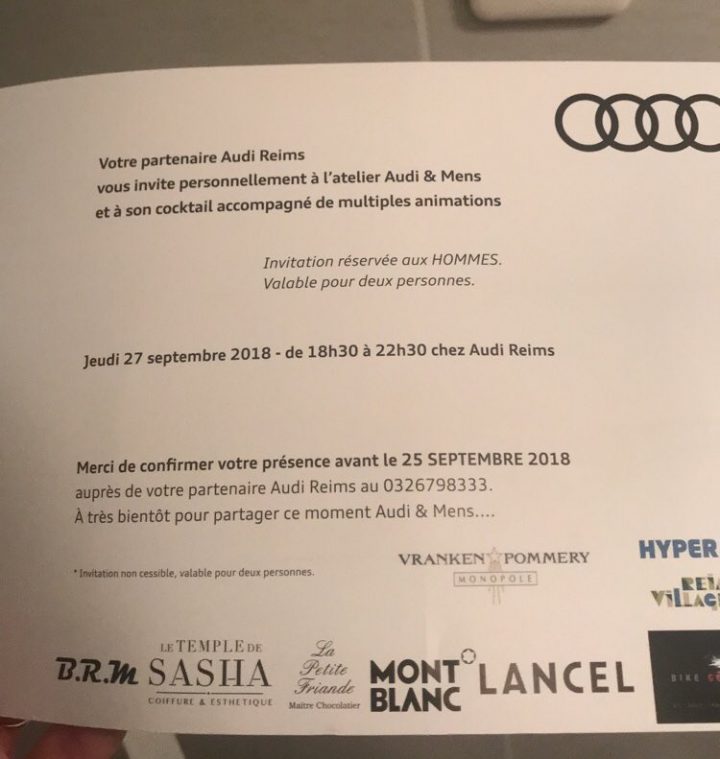 Un garage Audi, situé à Reims, a organisé le 27 septembre dernier un événement festif qui avait pour but de promouvoir la marque. Accompagné d’animations, l’invitation était lancée. Mais par contre, Mesdames, inutile pour vous de vous déplacer. Elle était uniquement réservée aux hommes.