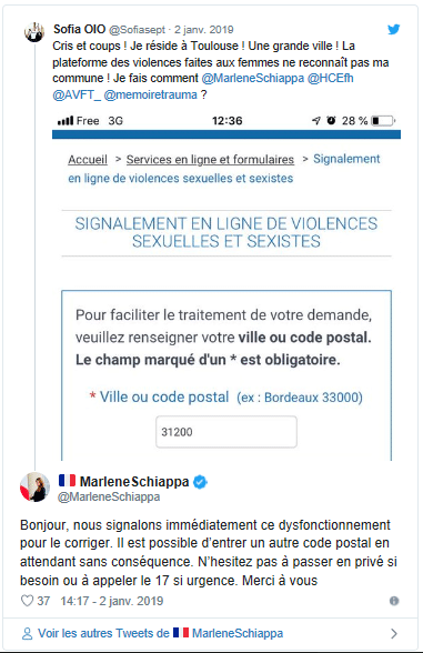 Elle avait alors interpellé Marlène Schiappa sur Twitter en lui signalant les dysfonctionnements de la plateforme officielle de signalements en ligne de violences conjugales et sexistes.