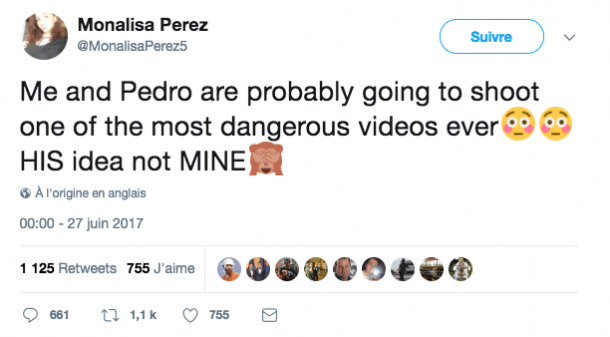 Dans son dernier tweet, Monalisa précisait qu’elle et son amoureux s’apprêtaient à réaliser une vidéo « plus dangereuse que jamais ». Elle insistaient également sur le fait que c’était l’idée de Pedro et pas la sienne.