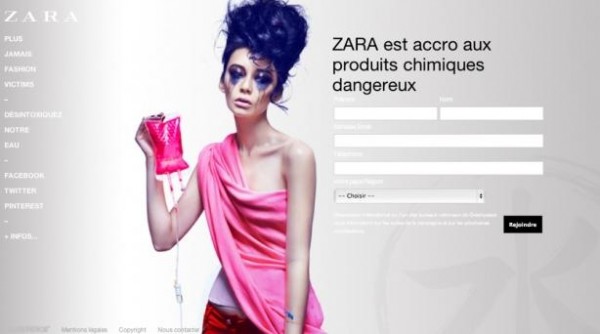 L’association pointe du doigt l’utilisation de produits chimiques dangereux à outrance par Zara. Une très très mauvaise pub pour la marque. Le site e-commerce de Zara est même détourné par Greenpeace pour illustrer ce qui est reproché à la marque…