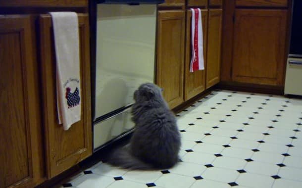 Hors catégorie, on a hésité avant de vous montrer ces images…un chat face à un lave vaisselle
