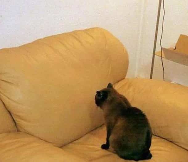Image insoutenable, un chat fixe un dossier de fauteuil…