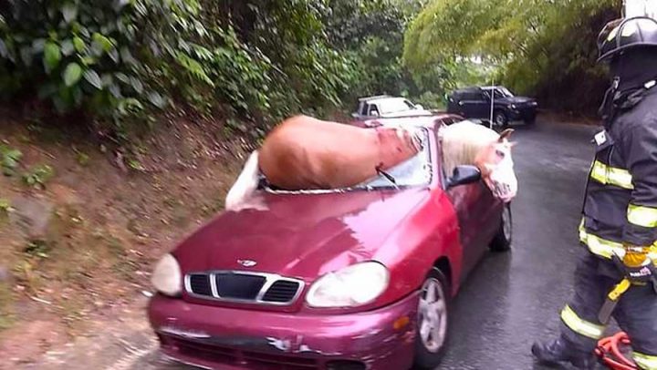 À Guaynabo, à Porto Rico, une Daewoo rouge est rentrée dans un cheval qui traversait la route. On ne connait pas la raison de la présence de Ranchero, ce cheval qui était seul sur la route. La voiture n’a pas freiné à temps et le cheval a explosé la vitre du parebrise, atterrissant les quatre fers à l’intérieur de la voiture. Par chance, il n’a pas écrasé le conducteur, qui a voulu garder l’anonymat. Pris au piège à travers les bouts de verre du parebrise, ce sont les secouristes qui ont dû l’extraire, en coupant toute l’armature métallique de la voiture.