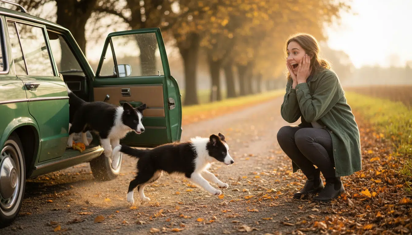 Lorsque la voiture de Marcelo s’arrête devant la maison, Victoria pointe sa caméra vers le véhicule, s’attendant à voir une seule petite Border Collie en sortir. Mais c’est le choc : non pas un, mais deux chiots bondissent hors de la voiture sous le regard médusé de la jeune femme.