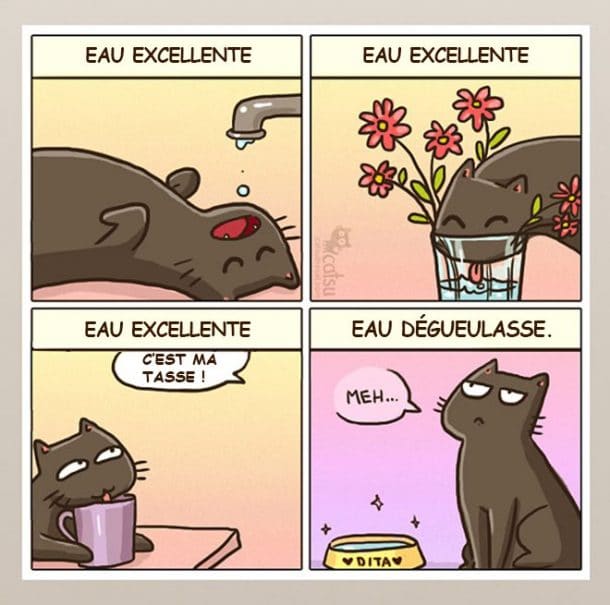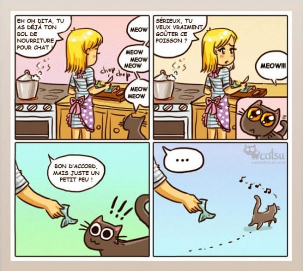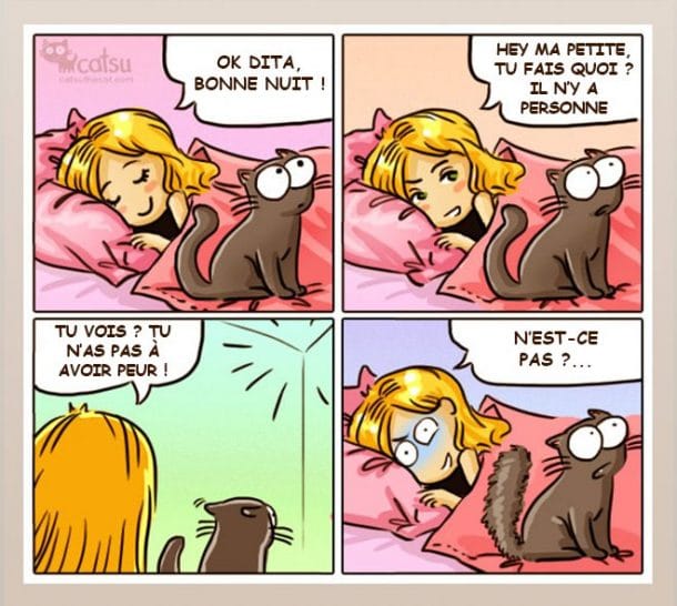 Mais qui se cache derrière les illustrations bien senties de Catsu The Cat ? Eh bien pas une personne, mais tout un groupe d’illustrateurs situé à Tallin, en Estonie. Chacun y va de son petit coup de crayon pour imaginer des situations plus rocambolesques les unes que les autres. Mais finalement, tellement criantes de vérité. Quoi qu’il en soit, on ne se lasse pas du quotidien (fictif) de cette fille aux cheveux blonds et de son chat Dita. Personnellement, je m’y reconnais à 100 % et vous ? Quelle est la vignette qui illustre le mieux votre vie de tous les jours avec votre petit félin ?