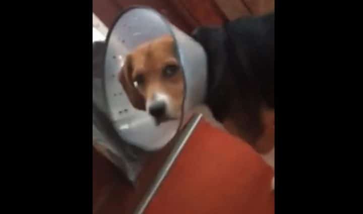 Eh bien le chien que vous allez voir sur cette vidéo est affublé de cet objet de la mort. Le pauvre petit beagle n’a pas tellement l’air d’apprécier. Qui aimerait porter ce truc en même temps ? En effet, les animaux perdent tous leurs repères avec ce cône de chantier sur la tronche. Il ne savent plus comment manger, ni comment monter les escaliers. La mienne ne savait même plus comment marcher. Bref, c’est la catastrophe. Et lorsque le petit chien tente de passer par la porte de la chatière, forcément, c’est le drame. Il réalise qu’il ne peut plus passer. Mais le plus fort, c’est le regard complètement désespéré qu’il lance à son humaine. Comme s’il lui disait : « Mais qu’est-ce que tu m’as fait ? ». Découvrez cette petite bouille dans la vidéo en haut d’article.