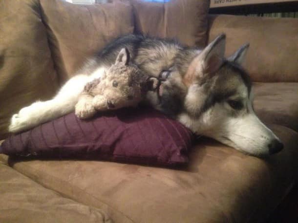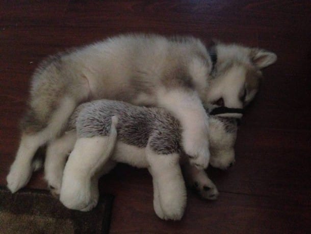 Luca est une chienne magnifique qui ne peut pas s’empêcher de faire craquer tous ceux qu’elle rencontre. Elle, elle a jeté son dévolu sur une peluche qui lui ressemble comme deux gouttes d’eau et qui appartenait à sa maîtresse avant que celle-ci n’ait Luca. Cette peluche est son doudou comme les enfants ont le leur. Elle le câline, le promène, dort à ses côtés! Quelle amitié irrésistible, craquante entre cette malamute originaire de l’Alaska et son double en peluche !