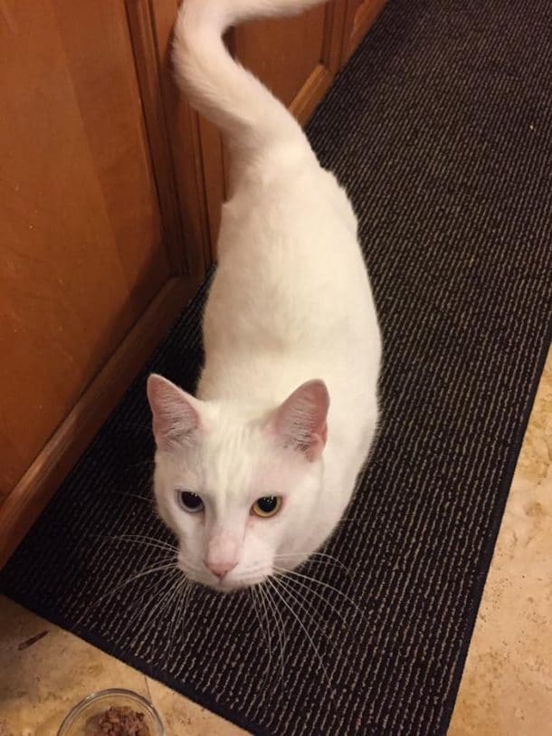 Il s’est avéré que Cotton souffrait d’une sévère gale. On peut d’ailleurs clairement voir que ses oreilles ont été touchées. Mais ses yeux l’étaient également. Si bien qu’au départ, tout le monde pensait qu’il était aveugle. En réalité, c’est la maladie qui lui empêchait d’ouvrir correctement les yeux. Il a donc reçu les soins nécessaires et a surpris tout le monde la première fois qu’il a ouvert les yeux. Eh oui, Cotton avait les yeux vairons ! Un œil jaune et un œil bleu. Et il faut bien avouer qu’il a un charme fou ce chat blanc.
