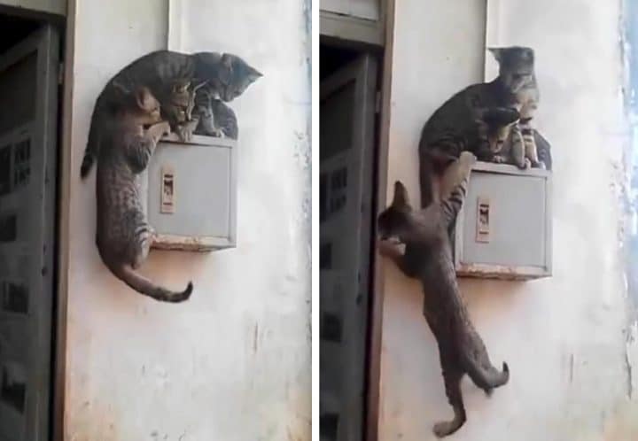 Ah les chats et leurs idées tordues ! Le petit chat de cette vidéo a bien galéré pour monter sur son boîtier électrique mais il y est finalement arrivé. Problème : ses deux frères étaient déjà perchés dessus lorsqu’il a voulu les rejoindre et il n’y avait clairement pas assez de place pour trois. Le petit félin a donc fait chuter les deux autres de façon lamentable en arrivant au-dessus. Une vidéo assez comique, il faut bien l’avouer. Le petit a tout donné ! À la fin, il est tout penaud de se retrouver seul sur son boîtier. D’autant que l’un de ses frères est tombé dans une gamelle. Bref, une scène cocasse comme on les aime !