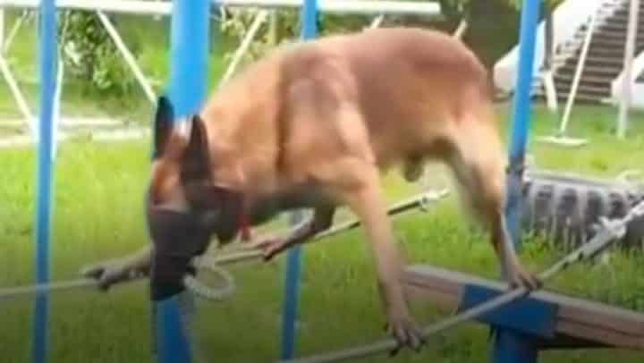 Un chien de police funambule traverse des cordes parallèles les yeux bandés