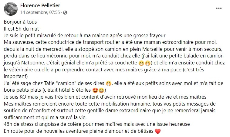 « Je suis le petit miraculé de retour à ma maison après une grosse frayeur ». Voilà commence le post de Florence, qui fait parler son propre chien. Elle indique notamment que c’est une camionneuse qui a découvert le canin, et qui a décidé d’être « une maman extraordinaire pour moi » . La femme aurait « stoppé son camion » dans les rues de Marseille afin de secourir l’animal. Perdu dans un lieu inconnu, le chien était livré à lui-même. Mais la camionneuse a tout fait pour rendre cette expérience traumatisante la plus agréable possible. Une véritable amoureuse des animaux sans qui les propriétaires n’auraient rien pu faire.