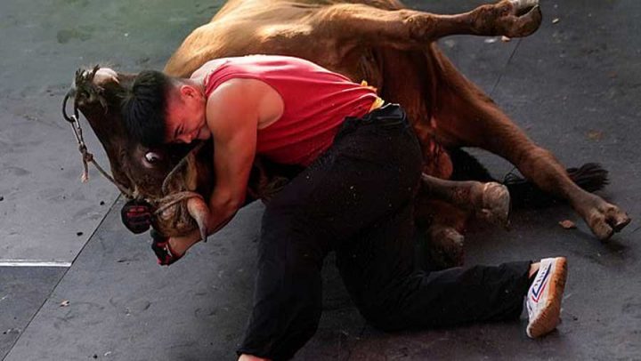 Ce jeune homme de 24 ans a été filmé en train d’attraper un taureau par les cornes, et lui retourner la tête pour la plaquer au sol. L’animal n’a pas d’autres choix que de s’abaisser et se coucher, comme si le combattant lui avait fait un clé. « Les combats de taureaux espagnols sont plus comme un spectacle ou un show », commente un spectateur assidu, qui préfère sa variante asiatique. Ici, il n’y a pas d’épées ni de scènes gores… sauf quand ça tourne mal pour le combattant qui affronte un animal très énervé. « Cette variante chinoise est une vraie compétition qui confronte les compétences humaines à celle d’un taureau. Il y a plein de techniques qui sont requises de maitriser car ça peut être très dangereux », explique Ren.