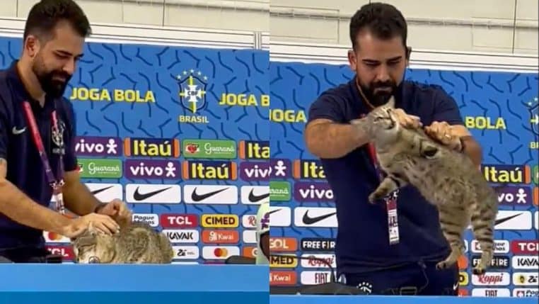 Si le chat semblait parfaitement à son aise, l’attaché de presse du Brésil n’avait visiblement pas envie que l’animal reste ici. Après l’avoir brièvement caressé, il a saisi le félin par la peau du dos avant de le lâcher à plusieurs dizaines de centimètres du sol.