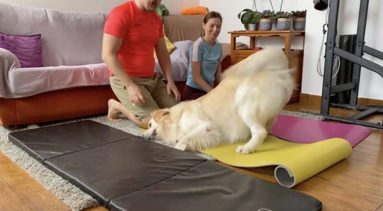 Sauf que Bailey est un peu trop énergique, il saute dans tous les sens, passe par-dessus son papa et léchouille le visage de sa maman. Difficile de faire du sport dans ces conditions… Le maître va chercher un troisième tapis afin que tout le monde ait le sien. Mais le golden retriever n’en a rien à faire.