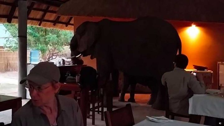 Des touristes américains prenaient tranquillement leur petit-déjeuner, quand soudain, un éléphant attiré par l’odeur du buffet, s’est invité au breakfast. Un second éléphant l’a suivi, et encore un éléphanteau par après. Les touristes restent figés de peur qu’un mouvement brusque ne les effraie et qu’ils réagissent en saccageant tout autour d’eux. Dans cette vidéo filmée par un touriste, on peut voir que l’éléphant gourmand se dirige vers les toasts à la confiture, renversant quelques tasses au passage maladroit de sa trompe sur le buffet.