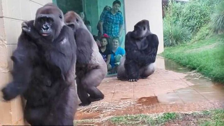 Les soigneurs du zoo Riverbanks de Columbia, en Caroline du Sud, ont été amusés par cette scène et se sont empressés de filmer. Ils se trouvaient à l’intérieur de l’enclos des gorilles, quand la pluie a commencé à tomber. De l’autre côté de la vitre, on peut voir les visiteurs du zoo, qui ont aussi assisté à cette scène. Les gorilles, qui tiennent des petits dans leurs bras, pour les protéger de la pluie, usent des mêmes techniques que les hommes lorsqu’il pleut. Rapidement, les grands singes longent les murs pour ne pas être touchés par les gouttes de pluie.