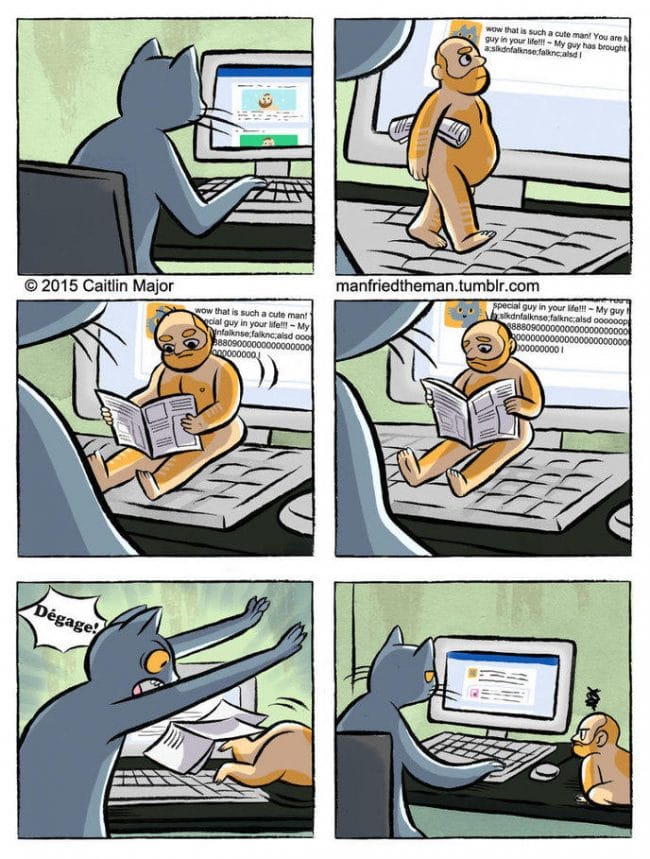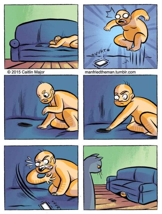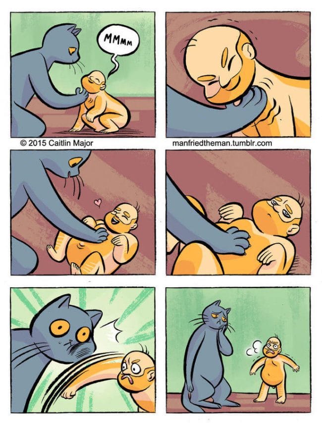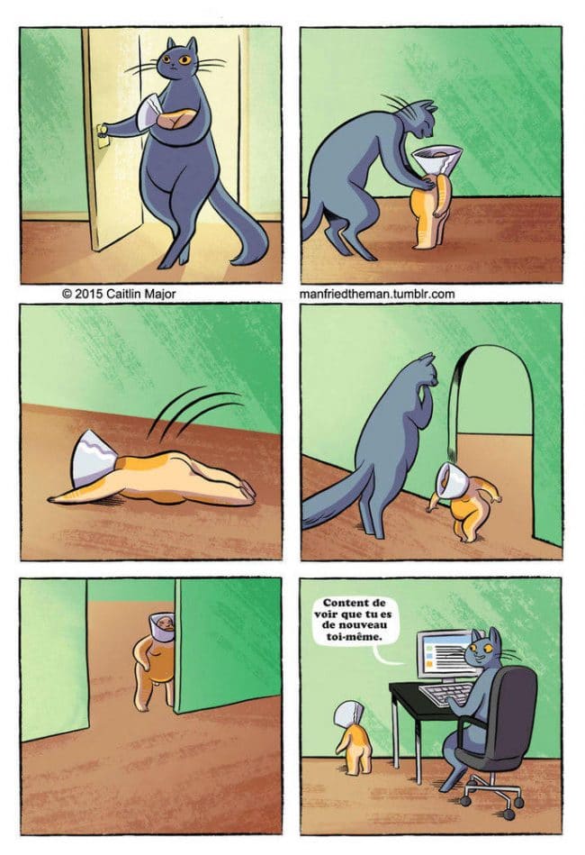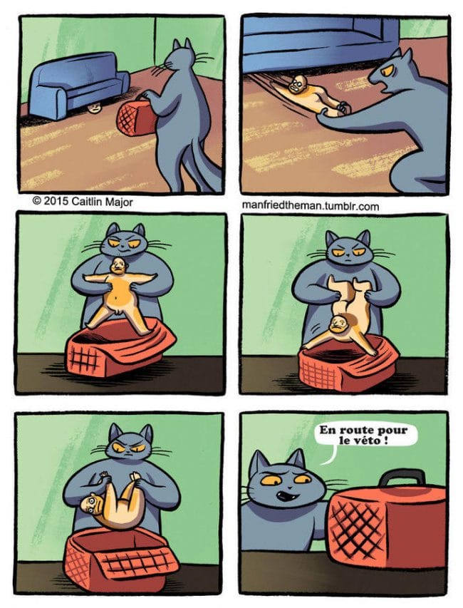 Nous en tant qu’humain, on gueulerait, comme beaucoup savent si bien le faire. Et on s’amuserait à se lancer à corps perdu dans des boîtes en carton comme des imbéciles. Allez, on vous montre le résultat en BD, c’est hilarant ! L’humain de compagnie s’appelle Manfried, pour info. Et pour retrouver toutes ses aventures à la noix, c’est par ICI.