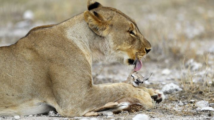 Le guide du Parc national Etosha, en Namibie, a expliqué au photographe Gordon Donovan que cette maman lionne avait le cœur brisé depuis qu’elle avait perdu ses lionceaux. C’est un mâle dominant qui a tué les petits, lors de son arrivée dans le groupe. Mais son instinct maternel n’a jamais faibli et elle n’avait qu’une envie, le combler. C’est alors qu’elle a porté tout son dévolu sur un bébé antilope.