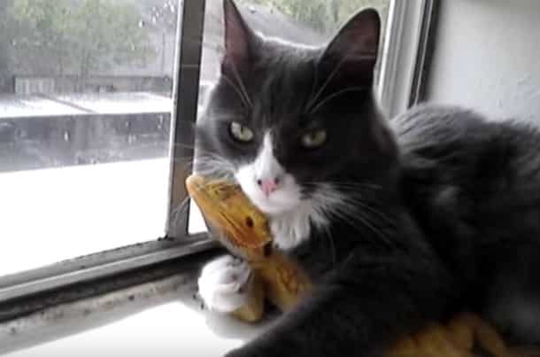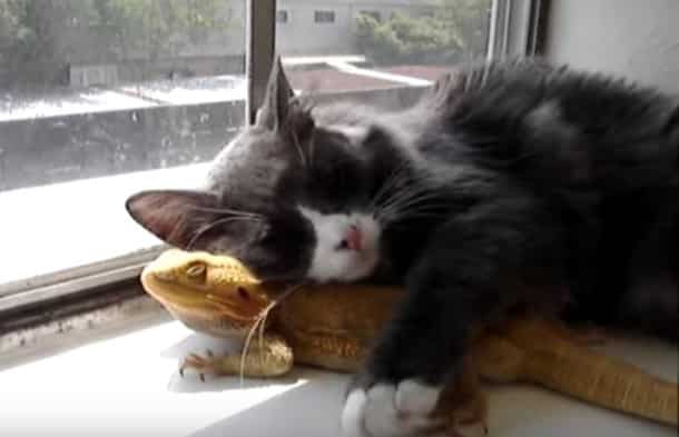 Une vidéo a fait le tour de la Toile, attendrissant petits et grands. C’est ainsi que Puppet, un jeune chat, s’est lié à un lézard Pogona prénommé Puff. Il le tient entre ses pattes et le protège. Même lorsque le chat s’endort, le lézard ne s’inquiète nullement, préférant rester à ses côtés.