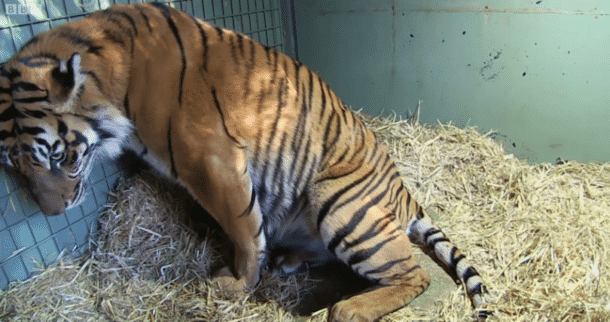 La tigresse a mis bas sous les yeux des soigneurs (qui la regardait depuis un écran, pour ne pas la déranger). On peut donc voir l’expulsion du bébé tigre qui s’est faite assez rapidement mais les choses se sont compliquées ensuite. Le bébé ne semblait pas réussir à respirer…