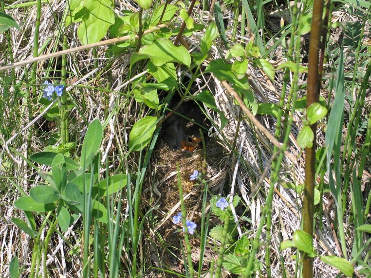 Le nid lui-même est parfois invisible, littéralement avalé par la végétation. Ce sont surtout les adultes qui donnent l’alerte, sans le vouloir. Au printemps, observez un rouge-gorge qui fait des allers-retours courts et réguliers, ou qui disparaît systématiquement dans le même angle d’un massif, d’un muret ou d’un tas de bois : c’est souvent le signe le plus fiable.