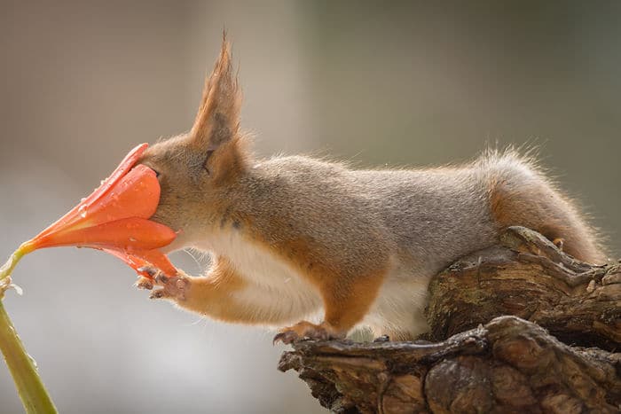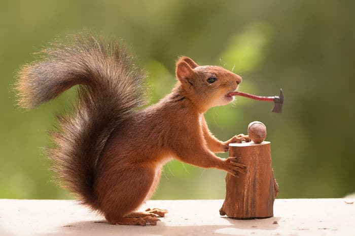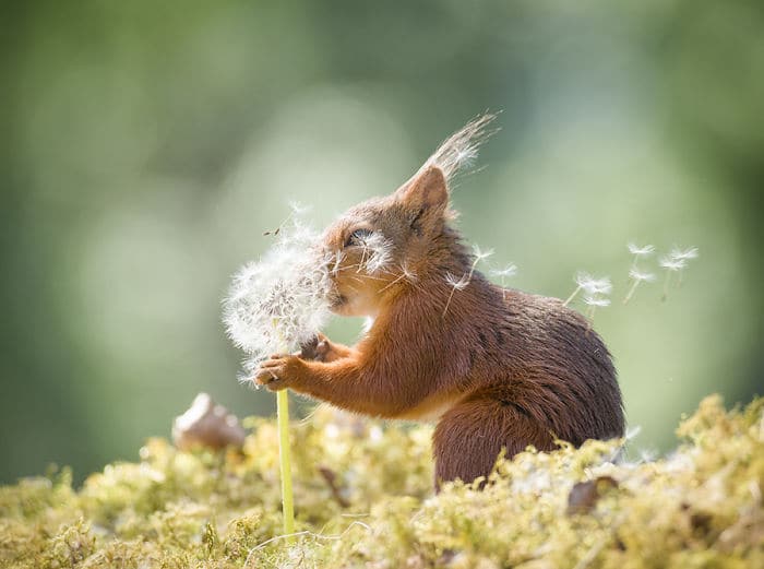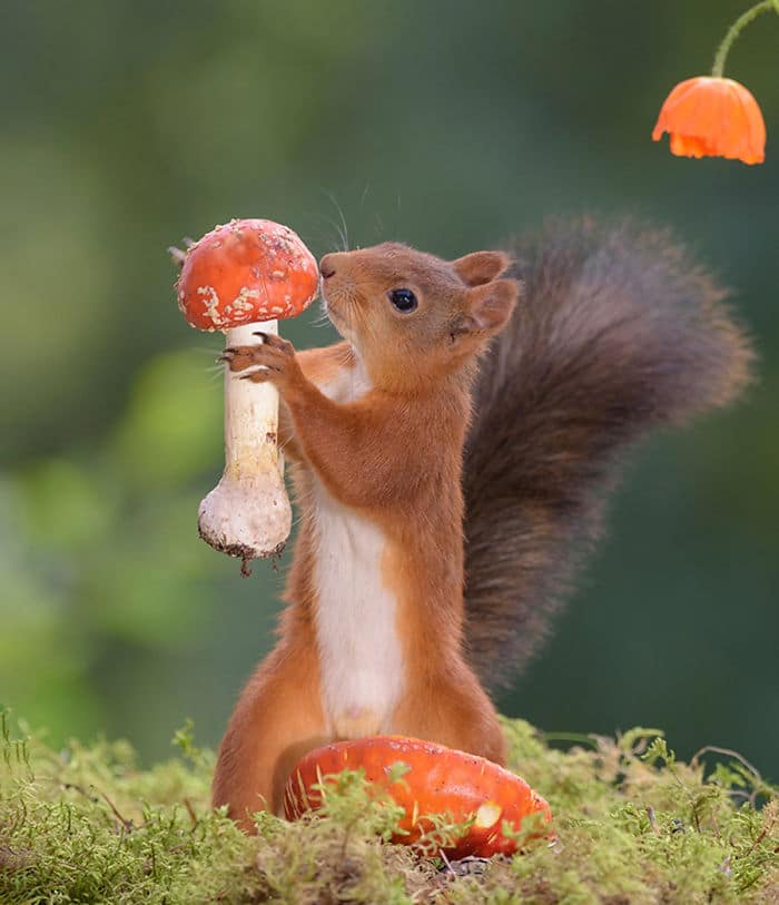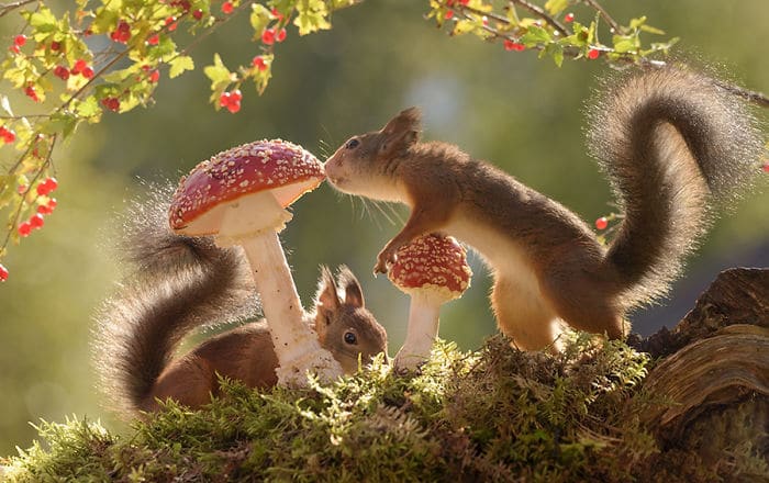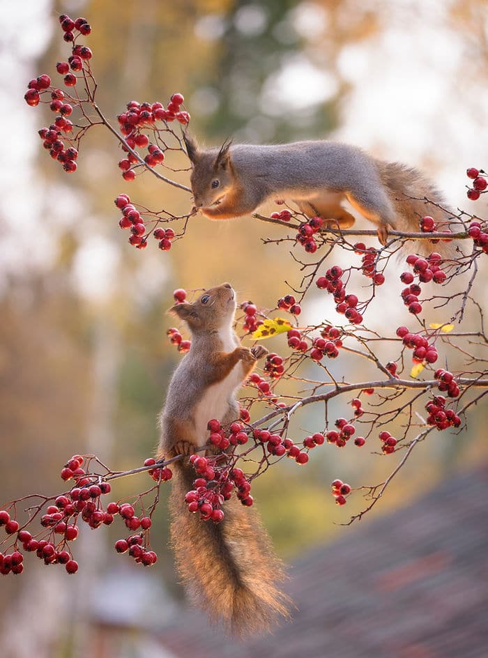 Geert Weggen est un photographe néerlando-suèdois spécialisé dans la photo d’écureuils roux. Il a été internationalement récompensé, et ses travaux ont été publiés dans des journaux, magazines, livres, calendriers, TV et radios. Il y a 6 ans un renard est venu sur le pas de sa porte en Suède, et le photographe lui a directement amené de quoi manger. L’animal est donc revenu chaque jour pour profiter de la nourriture offerte, et Geert en a profiter pour faire des photos. Peu après ça, un oiseau russe lui a également rendu visite. Le balcon du suédois est alors devenu un studio rempli d’accessoires naturels, de caméras et de miroirs. Ce sont ensuite des écureuils roux qui ont fait la connaissance du photographe, en revenant tous les jours comme les autres animaux curieux. Geert a mis en scène des situations avec ces écureuils puis les a pris en photos. Certaines de ses clichés ont été publiés et récompensés. Découvrez les 50 meilleures photos d’écureuils roux que ce passionné de photographie a capturées.