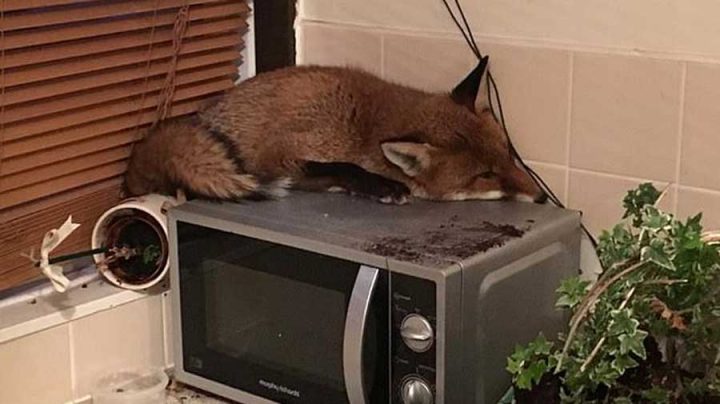 Kim Fryer et sa fille ont découvert un renard endormi sur le four à microondes dans la cuisine. Le renard s’était faufilé pendant la nuit, dans leur maison située à Mitcham, dans le sud-ouest de Londres. Au petit matin, il avait fini ses recherches et peut-être même qu’il avait avalé l’un ou l’autre bout de nourriture qu’il a trouvé dans la cuisine. Repus et fatigué, il n’a pas pris la peine de quitter la maison, préférant dormir au chaud.