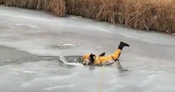 Ce sauvetage aurait pu très mal se terminer. Fort heureusement, le pompier finira par atteindre le chien et le sortir de l’eau. Et c’est en douceur que l’autre pompier au bout de la corde ramène les deux compères sur le rivage. Sous la vidéo, un message simple : « Tenez-vous éloigné de la glace ». C’est arrivé à un chien, mais cela aurait pu être un enfant, par exemple… Quoi qu’il en soit, un immense merci à ces pompiers qui ont tout risqué pour sortir ce pauvre loulou de la panade. C’est une chance qu’ils aient agi rapidement.