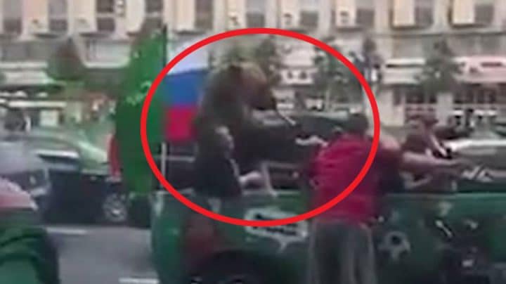 Scandaleux : Pour fêter leur victoire au foot, des Russes exhibent un ours qui joue de la vuvuzela