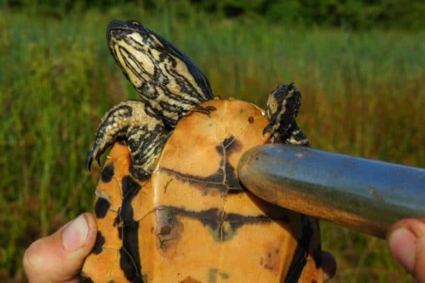 Au lieu de procéder à une entaille dans la carapace pour observer leur sexe, il est beaucoup plus doux d’utiliser un vibromasseur pour faire ressortir le sexe des mâles. En frottant un objet vibrant sur la partie plus molle de la carapace, près de la poitrine, la tortue est stimulée. Les massages lui procurent du bien et provoquent une érection. « Cela permet vraiment de comprendre la population et de réfléchir comment la préserver. Pour ce faire, il est obligatoire de distinguer les mâles des femelles. On ne fait pas ça pour le plaisir. Nous faisons ça car c’est une méthode beaucoup moins intrusive qui permet le sexage », explique Donald McKnight, doctorant à l’Université James Cook en Australie. L’étude de cet universitaire et de ses collègues va plus loin, puisqu’ils étudient aussi l’éjaculation de l’émyde réticulée (une race de tortue).