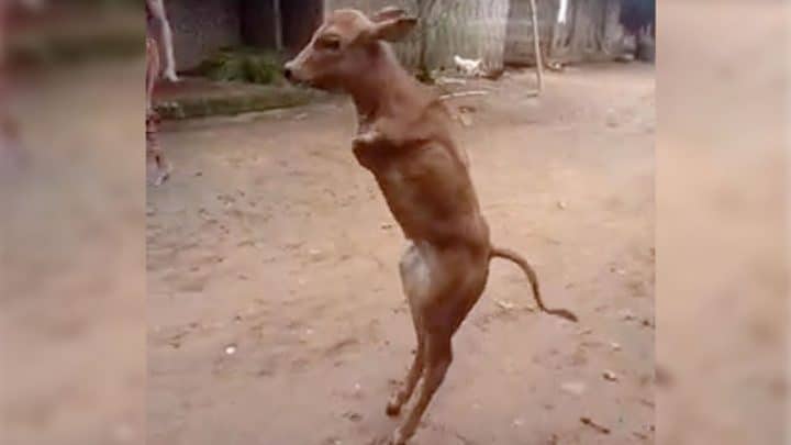 Un veau handicapé marche debout car il n’a plus de pattes avant ! Mais il est rejeté par les villageois dégoutés