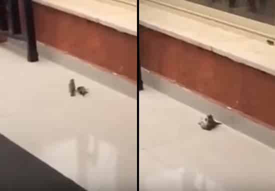 Pour celui-ci, les choses semblaient mal parties… Après avoir heurté la vitrine, il s’est retrouvé par terre, totalement assommé et inconscient. Un autre oiseau n’a pas pu se résoudre à abandonner l’un des siens en état de détresse et probablement en train de mourir. Il a réuni toutes ses forces pour tenter de réanimer son ami en lui faisant du bouche à bouche. Il n’a pa abandonné tant que l’autre oiseau n’avait pas repris conscience. Sa persévérance et sa détermination sont incroyables !