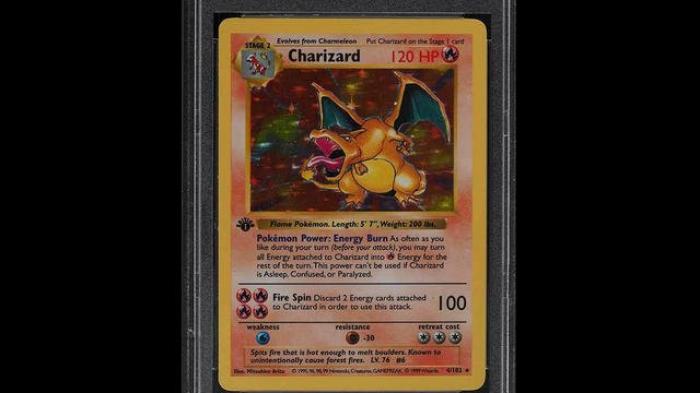 Cette carte vendue à prix d’or met en scène le Pokémon Dracaufeu lors de la toute première édition. La carte a été vendue comme neuve, protégée par un étui transparent sellé et vérifié par un organisme d’authentification.