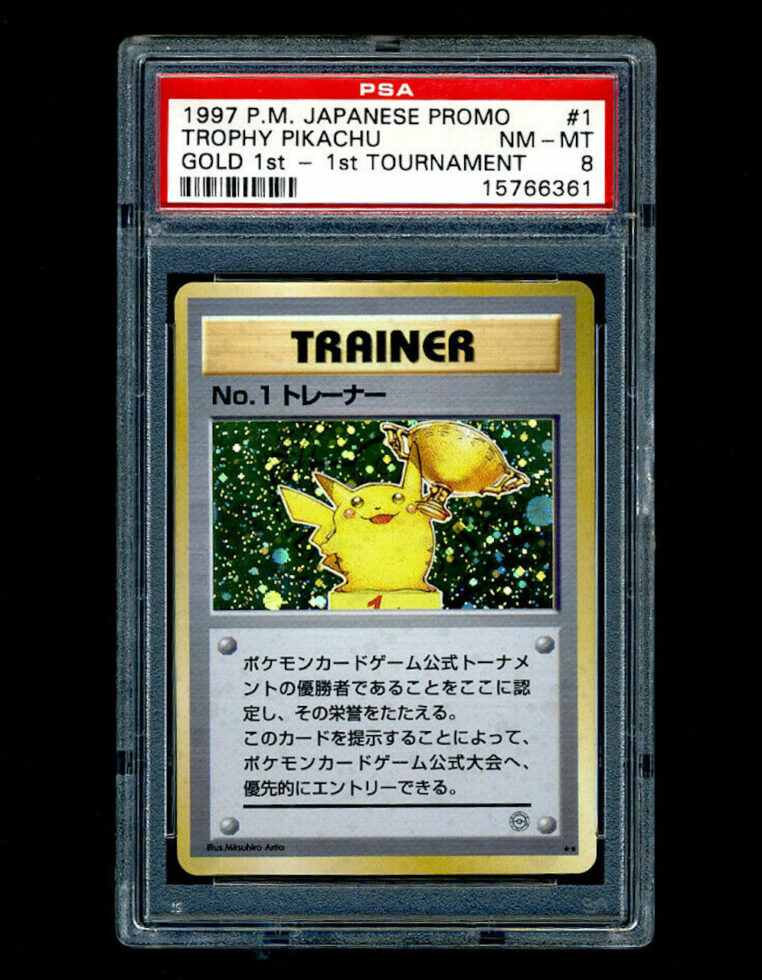 La carte Trophy Pikachu Gold a été donné en 1997 lors d’un championnat au Japon, aux participants qui atteignaient le podium. Cette carte est donc très rare et se vend à 100 000 dollars minimum lorsqu’elle est mise en vente.