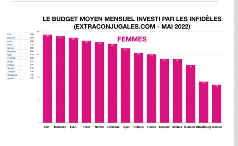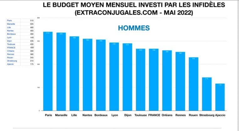 Selon une étude du site, les Français seraient particulièrement généreux envers leurs amants et notamment les hommes. Ces messieurs accordent en moyenne un budget de 400 euros par mois pour leur maitresse. Les femmes ne sont pas en reste : 230 euros par mois. Ce budget dépend évidemment du revenu mais aussi des villes. A Paris, on atteint 510 euros pour les hommes en moyenne : normal, c’est la ville des infidèles. Au contraire à Strasbourg, ils ne sont qu’à 215. Pour les femmes, ce sont les Lilloises qui sont particulièrement dépensières avec 290 euros par mois en moyenne, bien plus que les Toulousaines (190 euros)