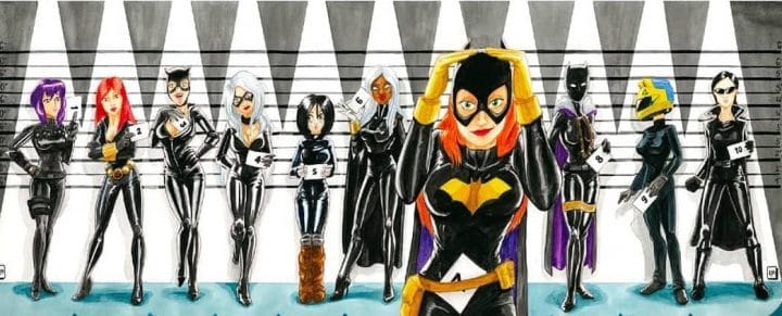 Toutes les femmes à combinaisons noires en cuir arrêtées