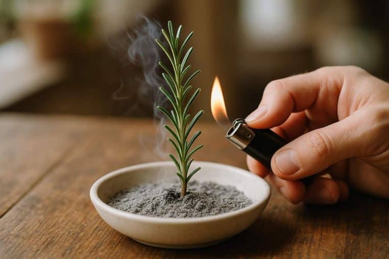 Pour essayer, il suffit de quelques branches sèches, d’un récipient résistant au feu et d’une allumette. Allumez une extrémité, laissez la flamme quelques secondes puis soufflez doucement. Le romarin va alors se consumer lentement et libérer son parfum. Déplacez le récipient de pièce en pièce pour que l’odeur se diffuse partout.