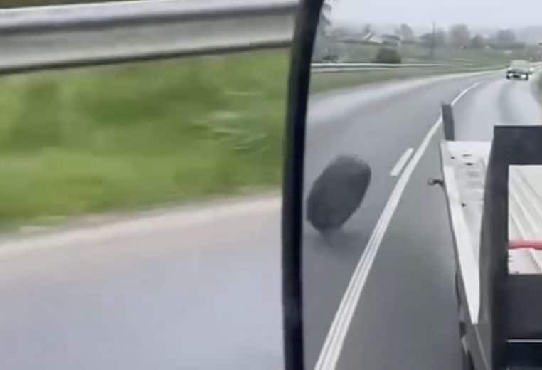 Un individu au volant de sa dépanneuse a vécu une mésaventure sur la route. Il s’est mis à filmer à travers son rétroviseur quand il s’est rendu compte qu’il avait perdu une roue de son plateau. Quelques secondes plus tard, c’est la seconde qui s’échappe.