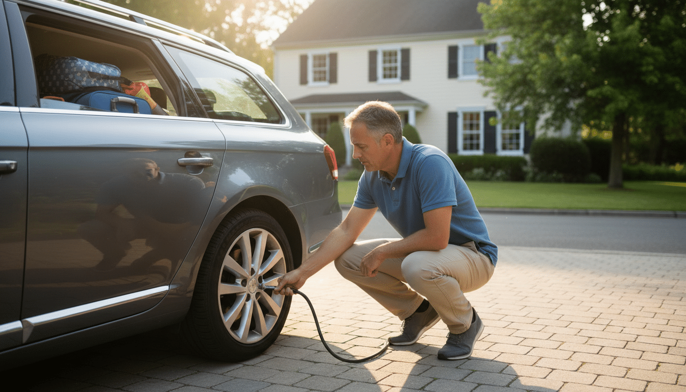 Commençons par ce qui touche le bitume. Les pneus sont impliqués dans un nombre impressionnant de pannes et d’accidents sur les longs trajets. La pression de gonflage est la première chose à vérifier : vous trouverez les valeurs recommandées sur l’étiquette collée dans la portière conducteur ou sur la trappe à essence. Si vous chargez la voiture à bloc — bagages, enfants, chien — ajoutez 0,2 à 0,3 bar par rapport à la pression standard.