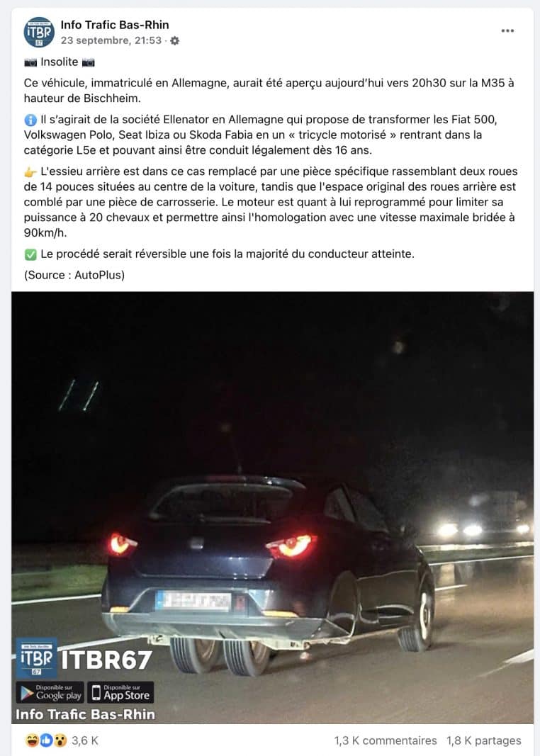Il semblerait que cette voiture soit liée à la société Ellenator, basée en Allemagne. Cette entreprise propose, en effet, une transformation unique pour certains modèles de voitures populaires. Parmi celles-ci, nous retrouvons par exemple la Fiat 500, la Volkswagen Polo, la Seat Ibiza ou la Skoda Fabia. Leur concept consiste à transformer ces véhicules en un « tricycle motorisé » qui rentre dans la catégorie L5e. Cela permet à des conducteurs dès l’âge de 16 ans de les conduire légalement. En parallèle, découvrez pourquoi Steve Jobs achetait la même voiture tous les six mois !