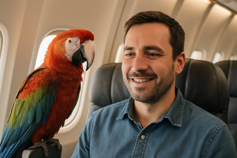 Dans l’avion, un passager est assis à côté d’un perroquet