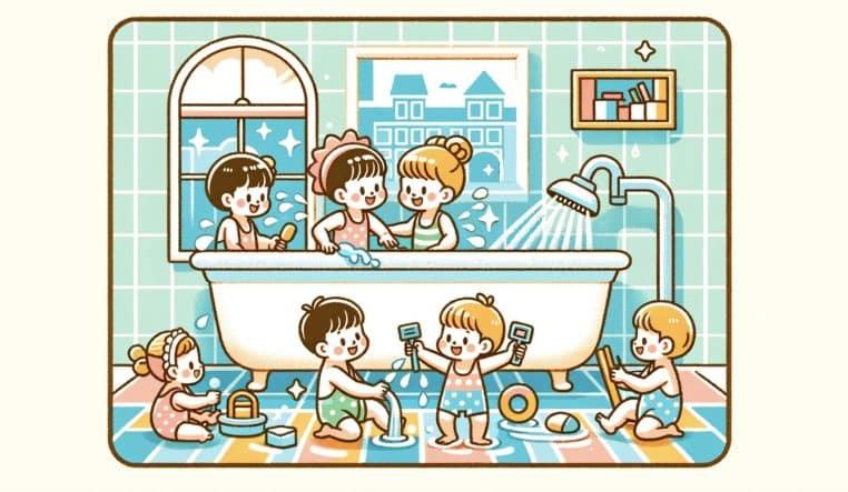 Toto et Lili prennent leur bain ensemble sous la surveillance de la maman de Lili.