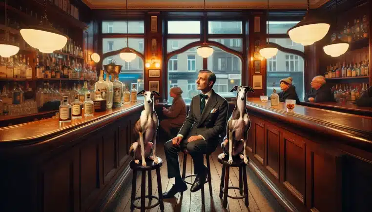 Un jour, les deux lévriers arrivent tous seuls et le barman leur sert deux vodkas, qu’ils boivent tranquillement…