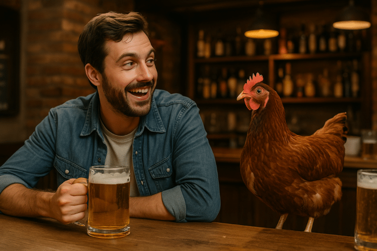 Un homme entre dans un bar avec… une poule. Il s’installe tranquillement, puis commande une bière. La poule le regarde et hoche la tête. Le barman, un peu interloqué, sert donc deux bières. L’homme tend un billet sans demander le prix, récupère la monnaie, et repart. Le lendemain, rebelote. L’homme revient avec sa poule, demande un burger et deux bières. La poule hoche la tête, comme d’hab. Même billet, même histoire. Le troisième jour, le barman n’en peut plus :