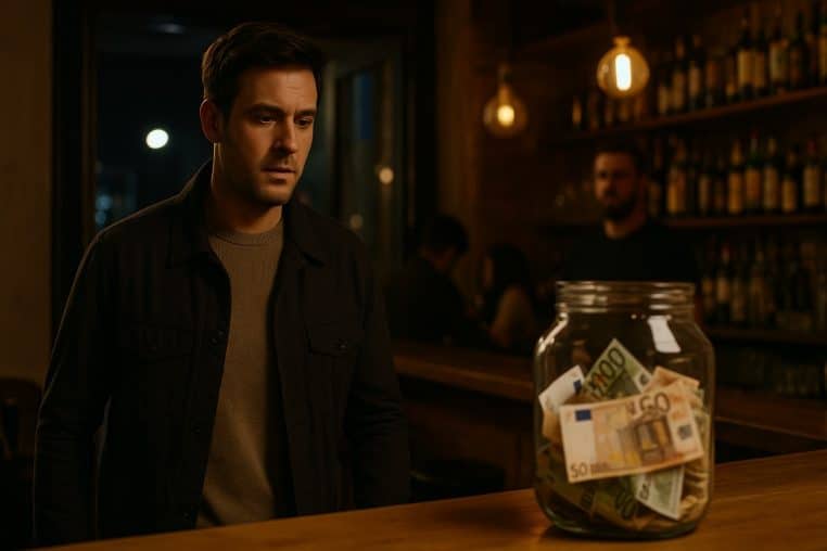 Alors l’homme lui tend un billet de 10 € que le barman ajoute aux autres dans la jarre.