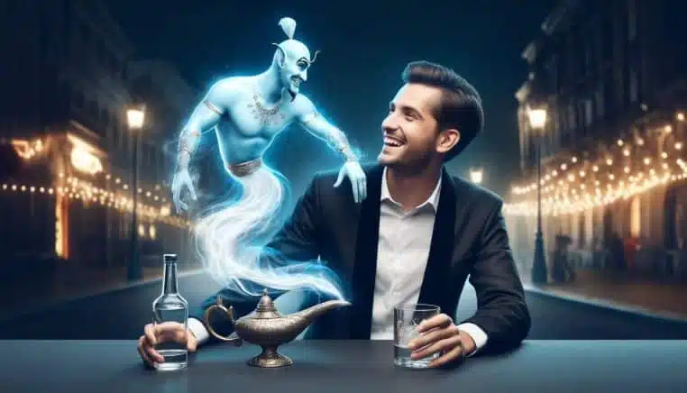 « OK, génie, je veux être en mesure de boire n’importe où et n’importe quand, alors change mon urine en vodka jusqu’à la fin de mes jours ! ».