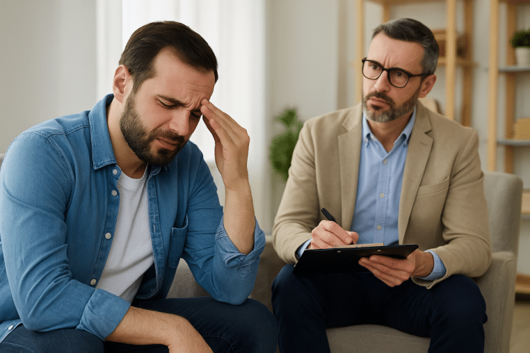Un homme est très angoissé. Rien ne va dans sa vie. Il dort mal, il est stressé, puis il fait des crises d’angoisse… Alors il décide de consulter un psy.