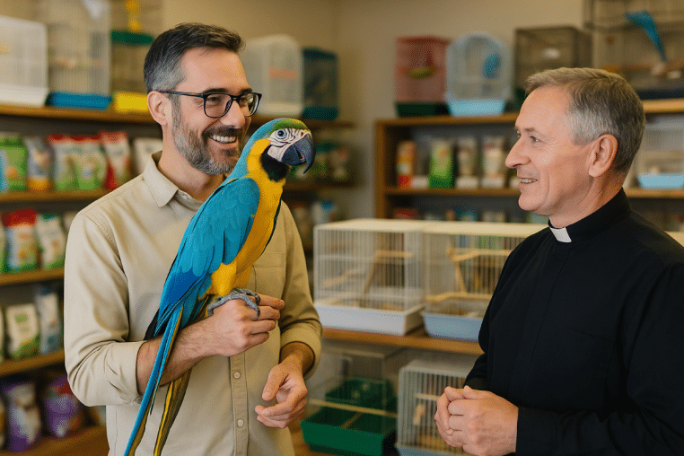 Un homme achète un perroquet chez un curé. Le curé lui dit :